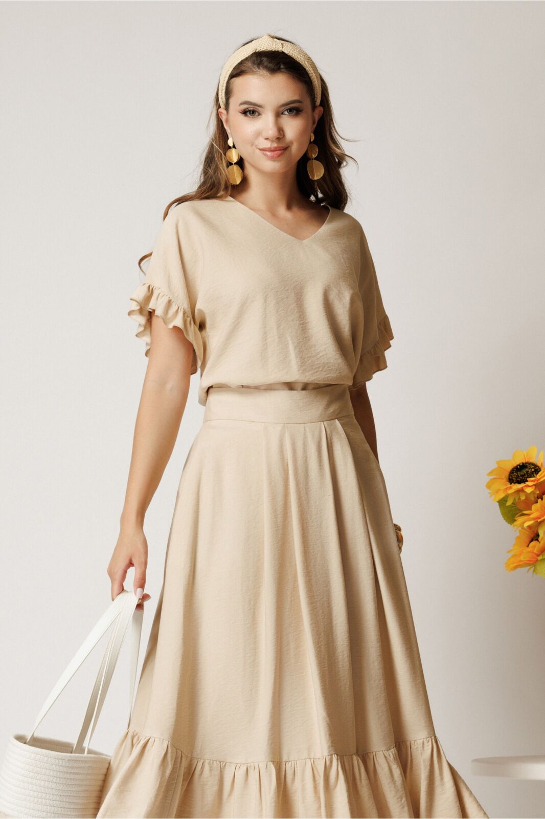 Black Friday 2025 Bluza bej din rayon cu croi drept si volanase la maneci