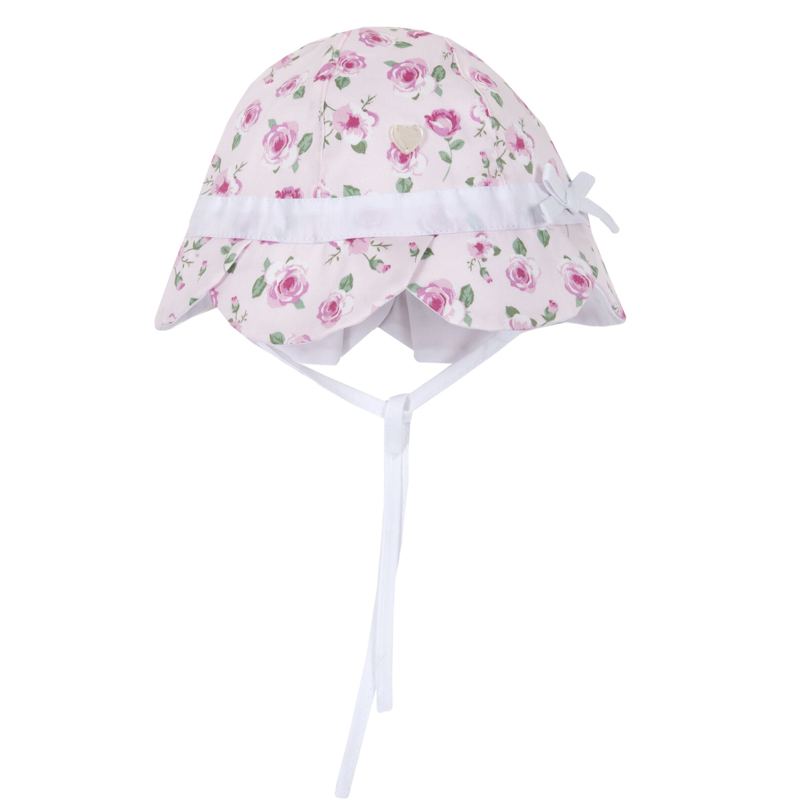 Palarie copii Chicco din poplin cu borurile in forma de petale si fundita. Foarte frumoasa si eleganta, se leaga sub barbie si are exteriorul confectionat din 98% bumbac si2% elastan iar dublura din 100% bumbac.