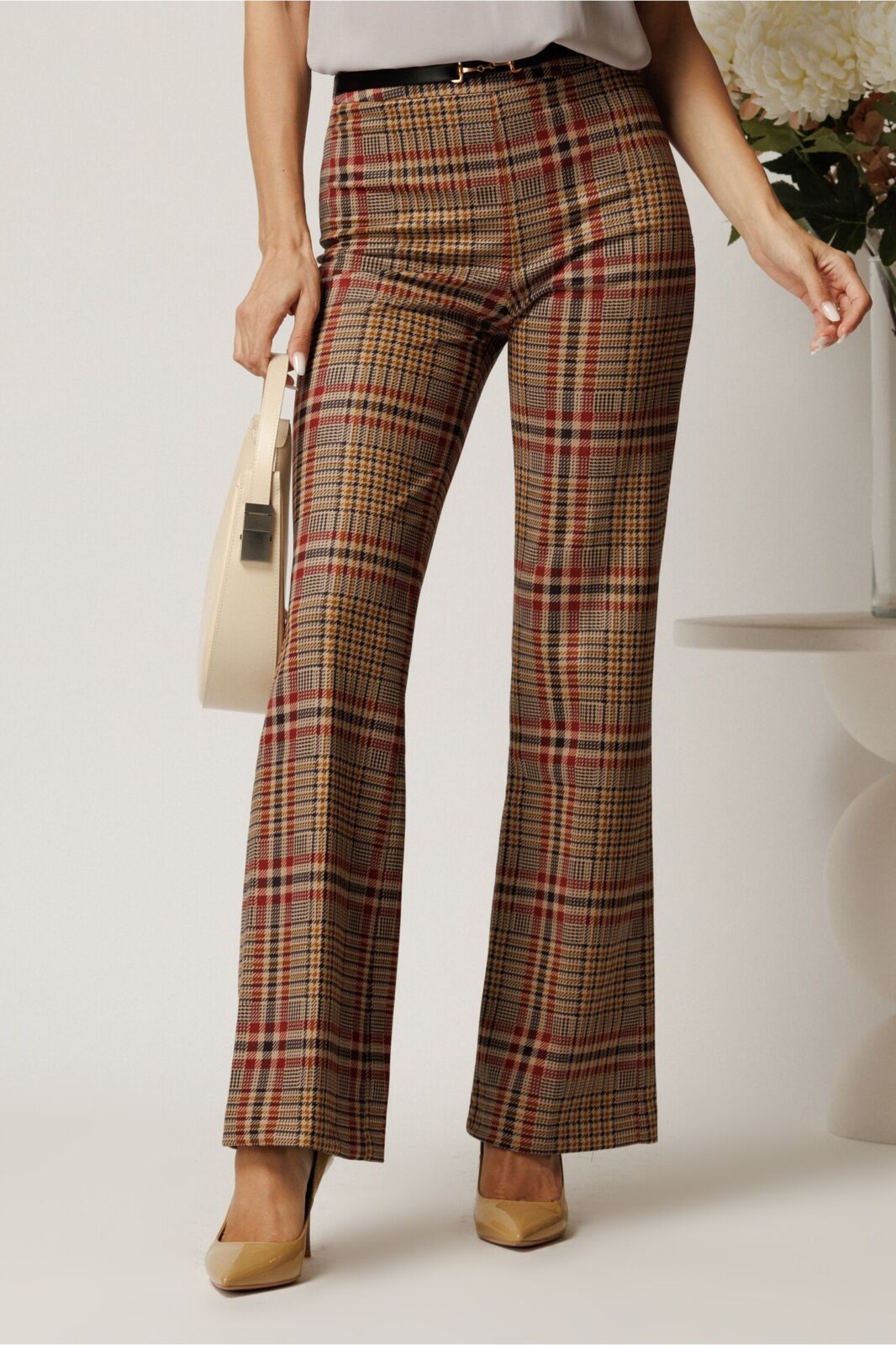 Black Friday 2025 Pantaloni DY Fashion office evazati din stofa catifelata maro cu carouri bordo si accesoriu in talie