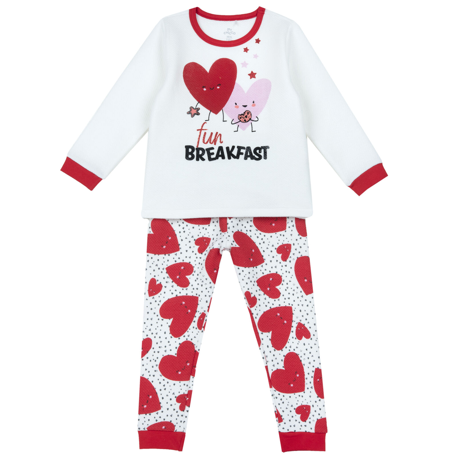 Pijama cu maneci si pantalon lung, cu inimioare imprimate, realizata din 70% bumbac si 30% poliester, detine certificare OEKO-TEX: calitate pentru copilul tau.