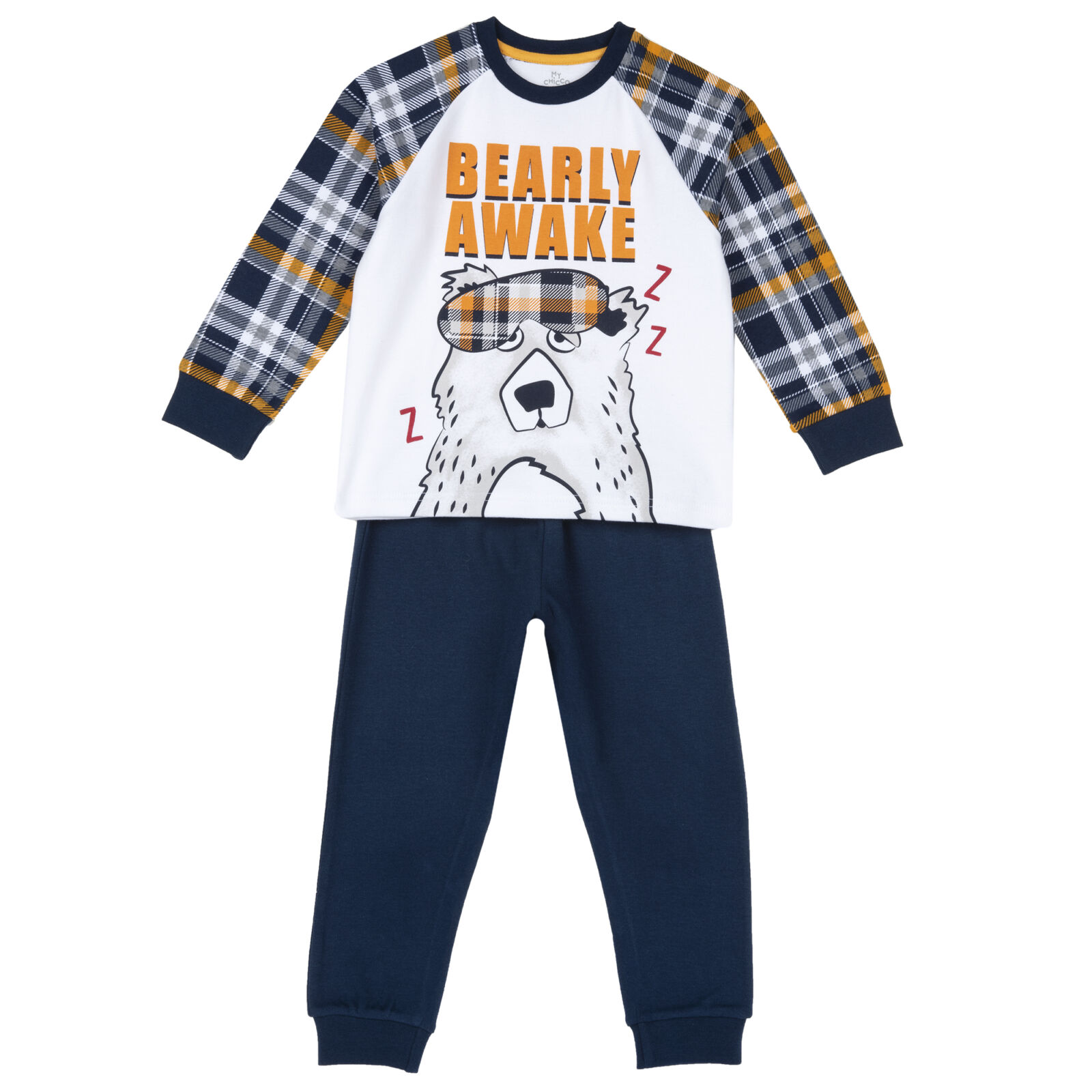 Pijama cu maneci si pantaloni lungi, cu imprimeu vesel, realizata din 100% bumbac Bio,poartaeticheta Sustainable Parentting .