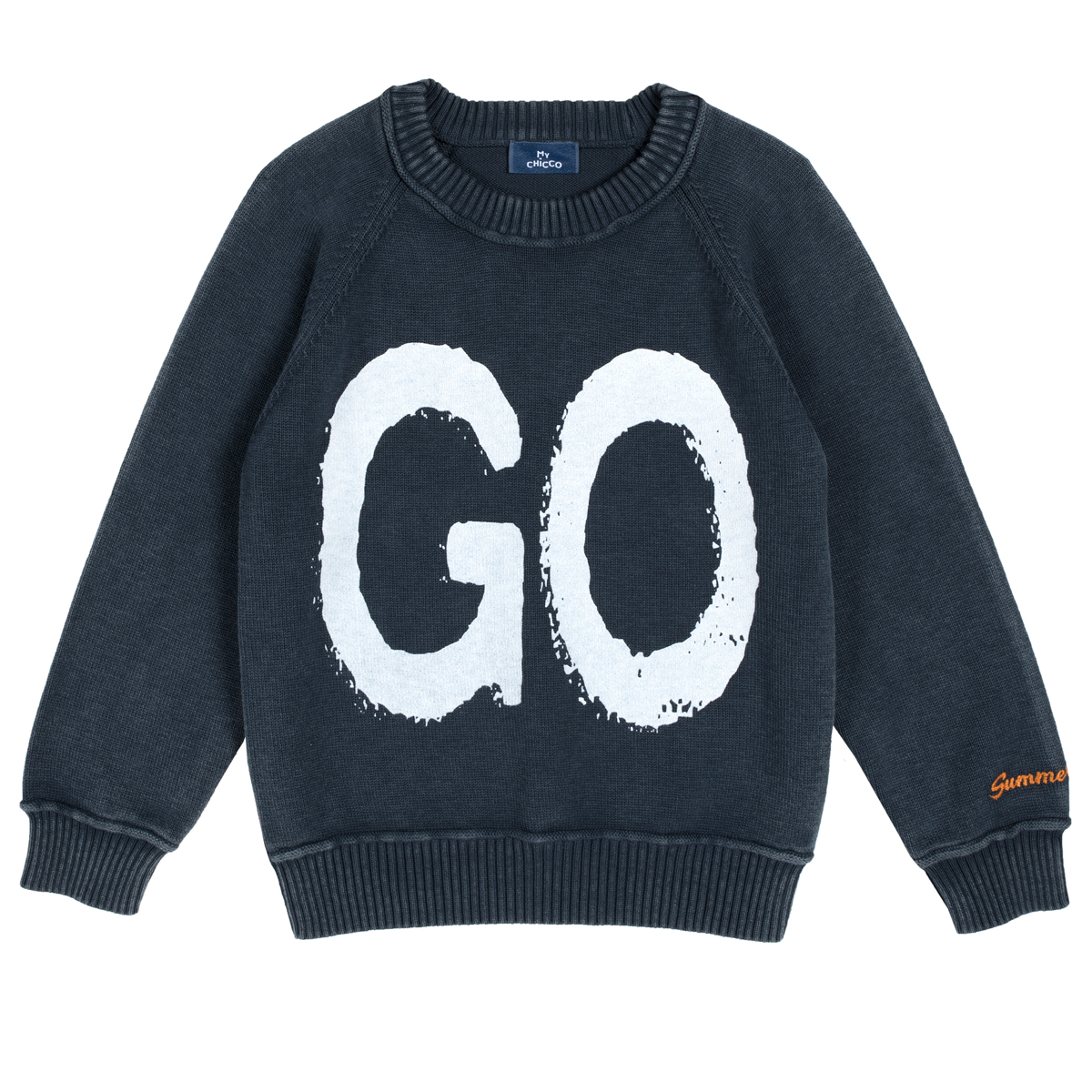 Pulover copii Chicco, maneca lunga, albastru inchis, 69358Pulover cu mesaj, maneci lungi, la baza gatului. Foarte dragut si calduros, tricotat din fir de bumbac 100%.