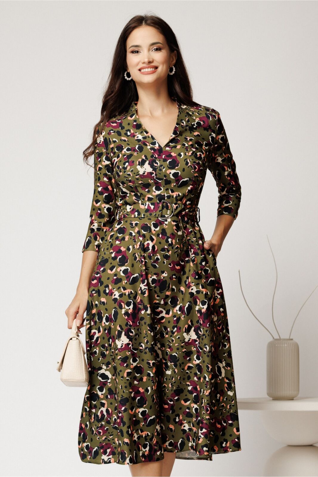 Black Friday 2025 Rochie midi kaki din crep cu imprimeu magenta si cordon in talie