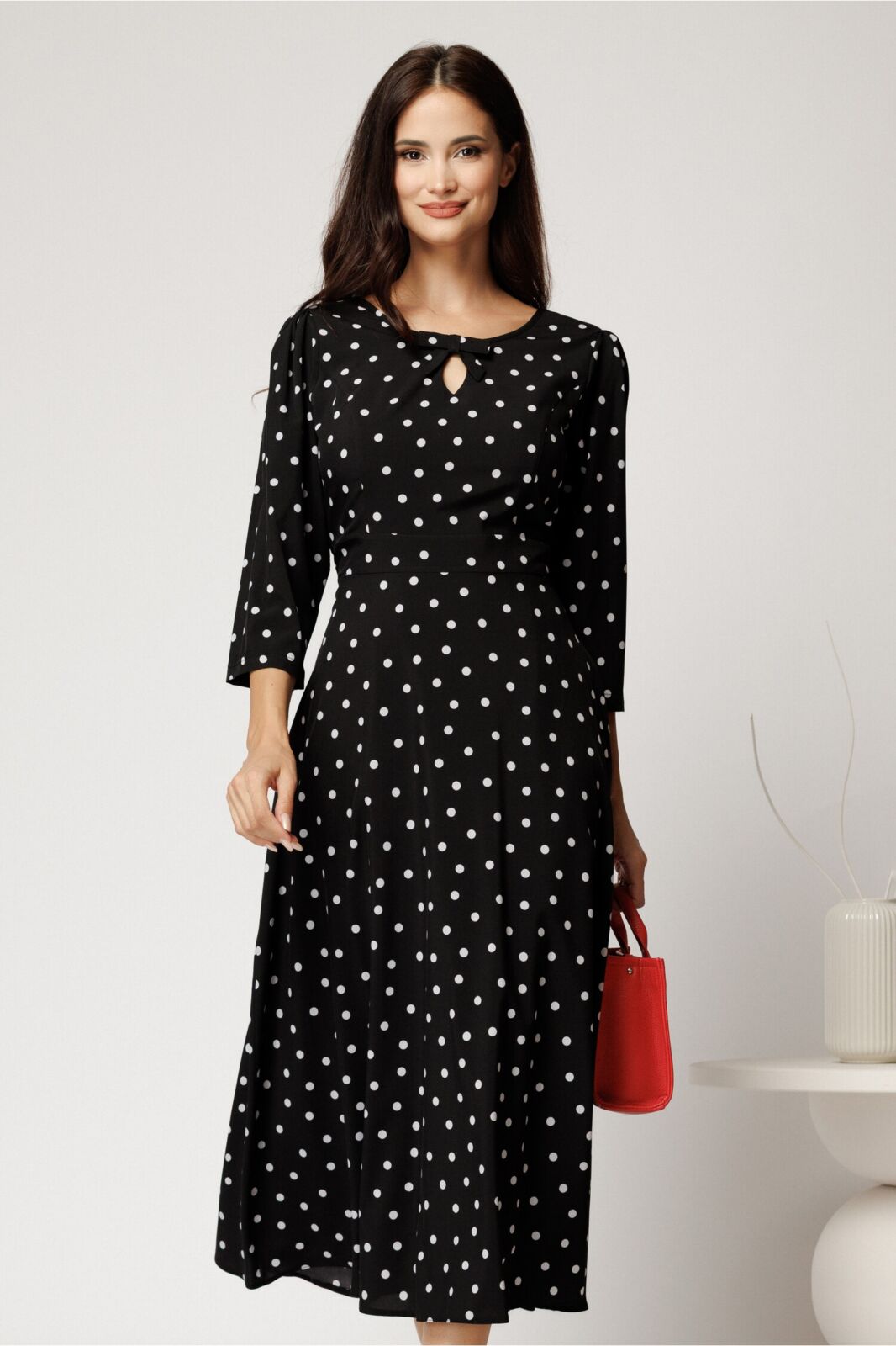 Black Friday 2025 Rochie midi neagra cu buline din viscoza in clos cu funda si decupaj la decolteu