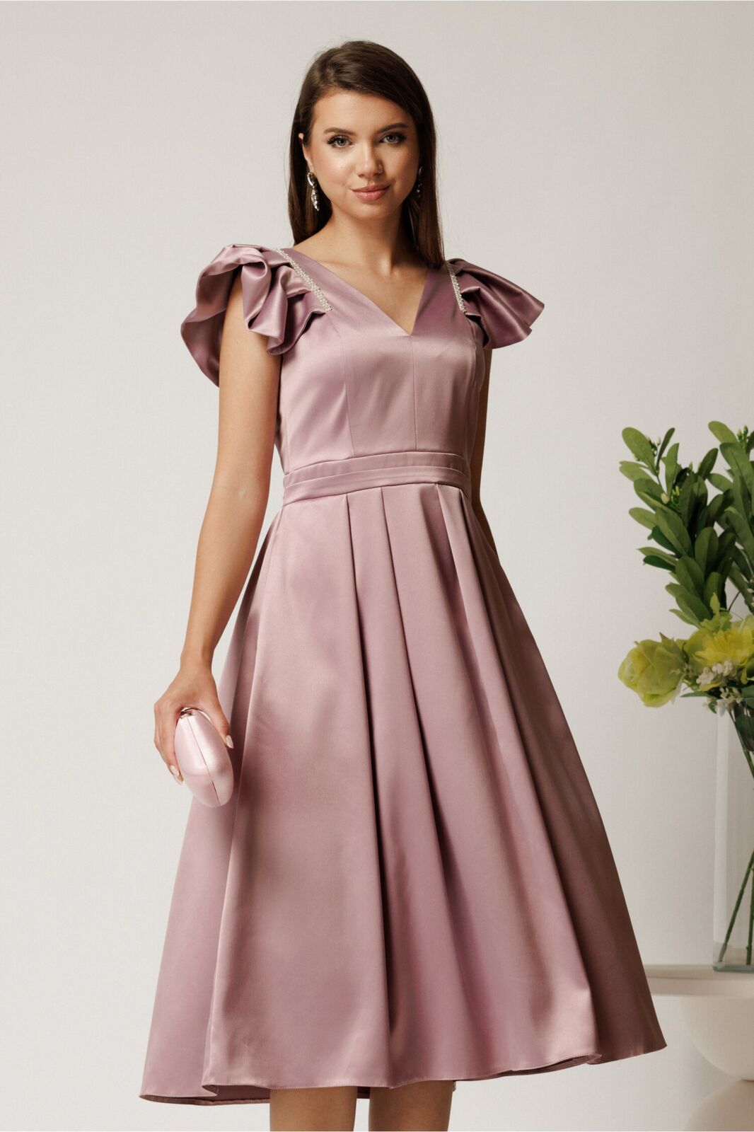 Black Friday 2025 Rochie midi roz din tafta in clos cu perlute si volane la maneci