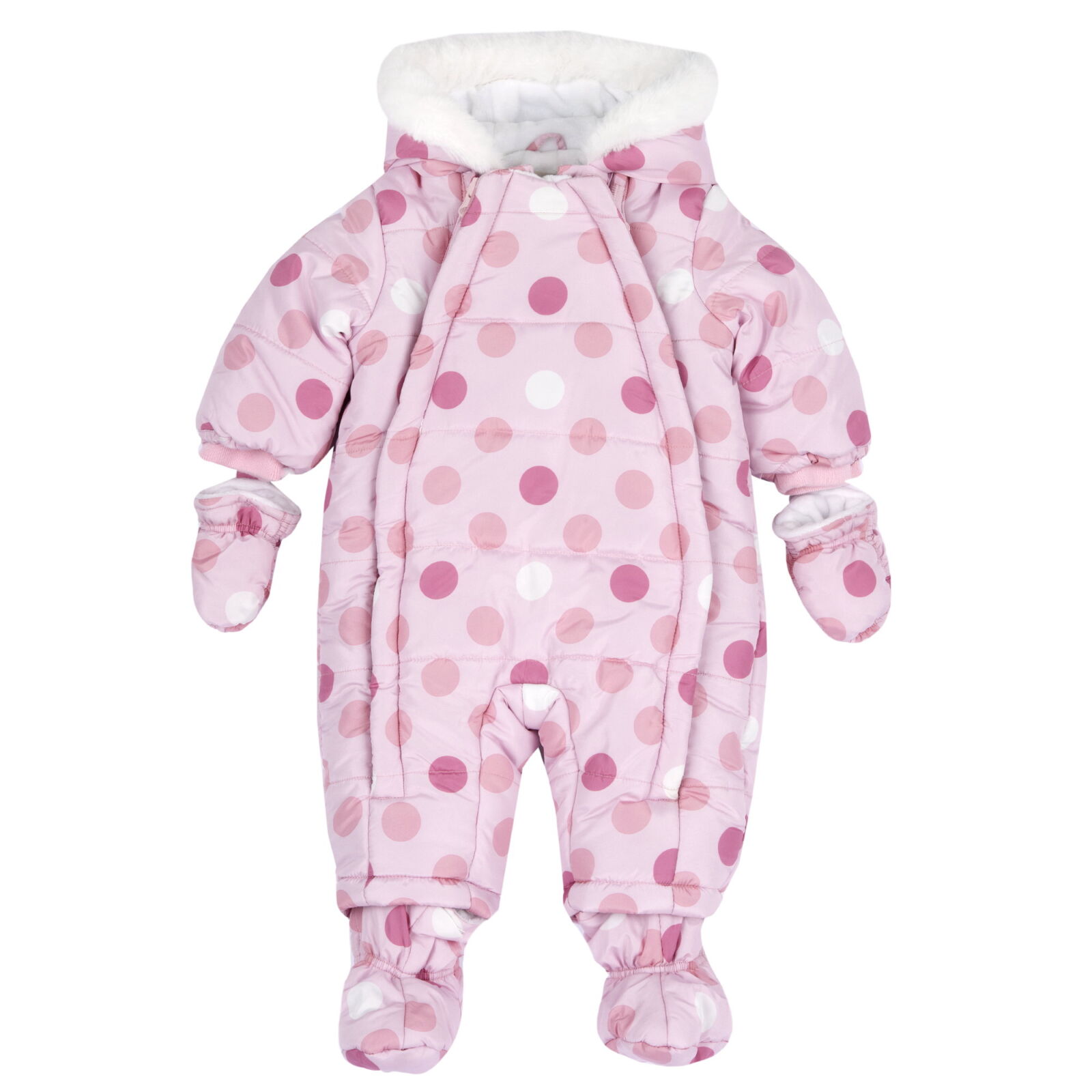 Salopeta de iarna matlasata, cu gluga incorporata, botosei si manusi detasabile realizata din 100% poliester. Salopeta nu contine materiale provenite de la animale si poarta eticheta Sorona Aura pentru materiale de calitate.
