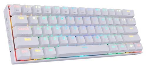 Tastatura Bluetooth si cu fir gaming mecanica Redragon Draconic alba iluminare RGB, switch-uri Outemu maro, 4 switch-uri de schimb, protocol bluetooth: 5.0, se pot conecta 3 device-uri simultan (se selecteaza device-ul pe care il folositi din switch-ul de pe laterala tastaturii), baterie: 240mAh, toate tastele fara conflict – 61 taste (n-key rollover), iluminare LED RGB a tastelor (13 moduri de iluminare, reglarea intensitatii), functie de inregistrare macro on-the-fly, tasta WIN poate fi dezactivata in timpul jocurilor, conector USB Type-C placat cu aur, USB, dimensiuni: 292x102x36mm, greutate: 0.8kg